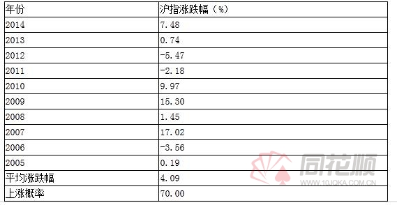 说到7月份,有“五穷六绝七翻身”的说法。统计显示,从2005年7月到2014年7月十年时间里,只有3年时间,上证指数是下跌的,其余7年时间,上证指数都是上涨的,十年间,上证指数在7月份的平均涨幅为4.09%。